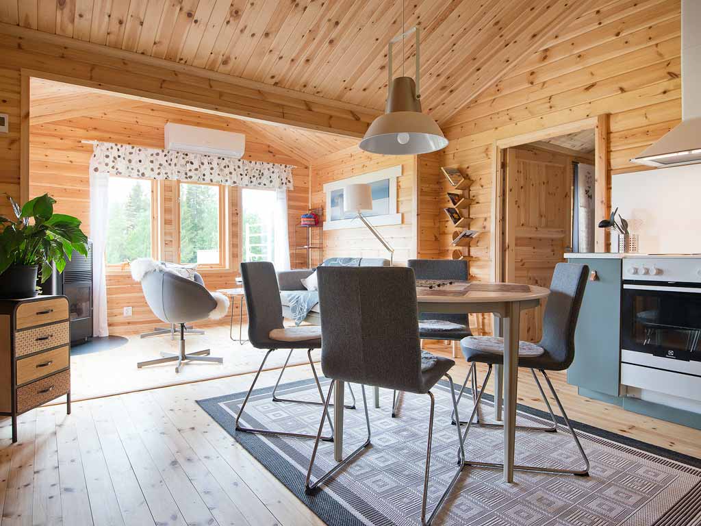 Pour une surface de 55 m2 chacun, composés d'une cuisine tout équipée, ouverte sur un salon avec vue sur la rivière avec leur poêle pour une flambée éventuelle pour l'après Pêche de fin de saison.